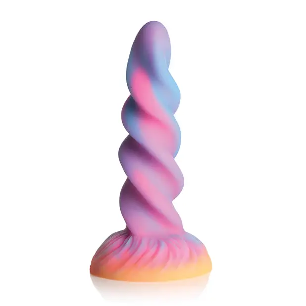 Magic comes in many shapes and sizes, and this Moon Rider Unicorn dildo is the perfect shape for you! The sunburst of purple, blue, pink and yellow colors are bright during the day and when it gets dark the glow in the night! It has a small, pointed tip for easy insertion and a spiral horn with soft, round edges. Made out of premium, flexible, phthalate-free silicone, this dong is body-safe and best used with water-based lubricants only. Enjoy hands free rides due to the strong suction cup base! Invite a partner to indulge in kinky cosplay or fantasy roleplay and use their favorite harness to transform this dong into a strapon! Afterward, make sure to wash it with warm water and mild soap, then spray it with a toy cleaner and air-dry. Keep out of direct sunlight and heat.