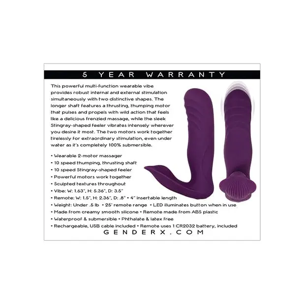 This incredibly versatile wearable vibe has two distinct shapes that work in perfect harmony to provide intense and pleasurable internal and external stimulation. The longer shaft features a thumping motor that pulsates and propels with wild action, while the sleek Stingray-shaped feeler vibrates intensely wherever your heart desires. These two motors work tirelessly together, even under water as the vibe is completely submersible. Wearable 2-motor massager. 10 speed thumping, thrusting shaft. 10 speed Stingray-shaped feeler. Powerful motors working in tandem. Textured details throughout. LED lights up when in use. Made from smooth and creamy silicone. Remote crafted from ABS plastic. Waterproof and submersible.