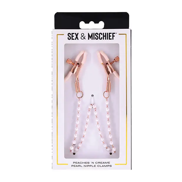 Take a tastefully tantalizing step into deeper sensations with the Peaches n’ CreaMe Pearl Nipple Clamps. Explore delicious sensitivity right where you want it most with dual adjustable clamps in stunning rose gold with pearl accents. White rubberized tips add a playful pop of color to your play and keep the clamps from slipping as you tease and pull your lovers chain, bringing intense feelings to their body.